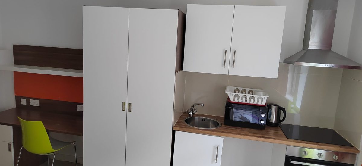 The Twin Studio room has the same features as the Single Studio room. Students in a Twin Studio room share their bathroom and kitchen with each other.