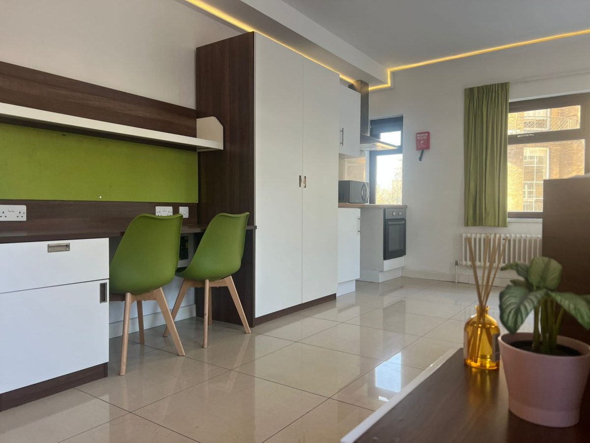 The Twin Studio room has the same features as the Single Studio room. Students in a Twin Studio room share their bathroom and kitchen with each other.